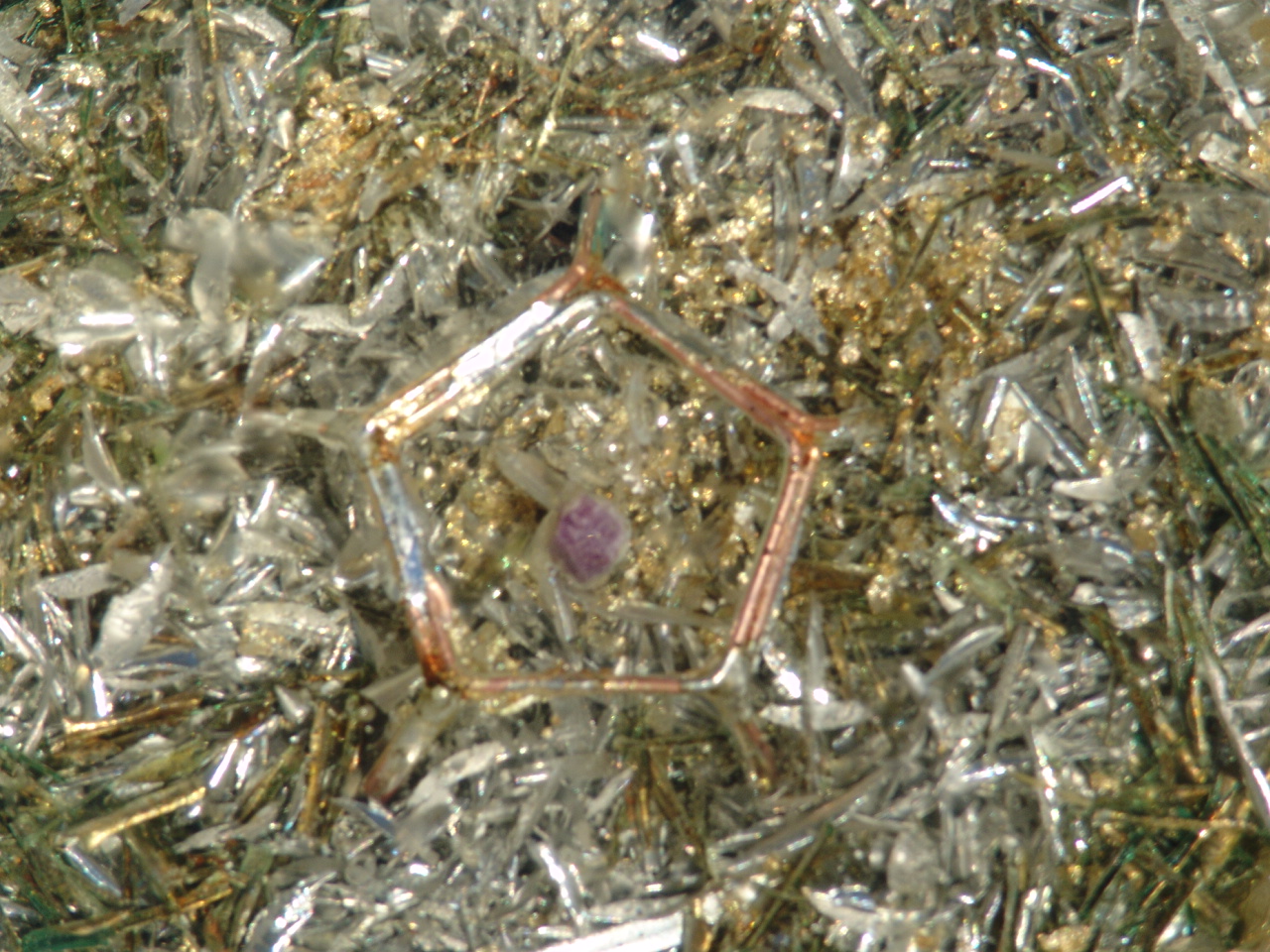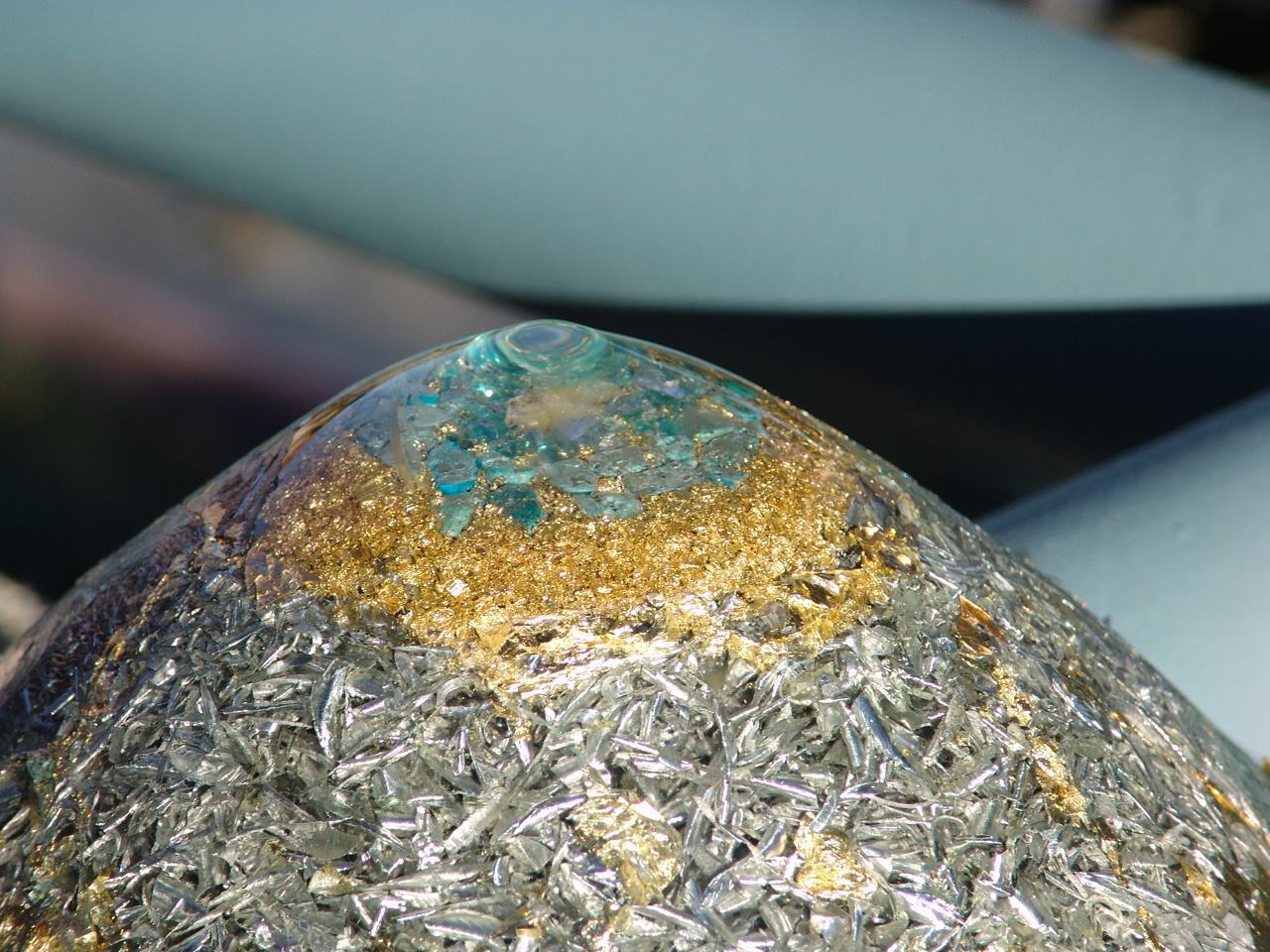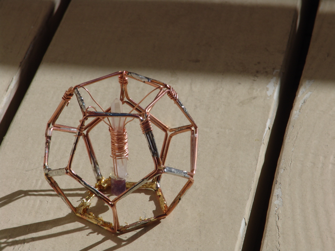 aluminum and brass shavings and showered with gold flakes. Crowning this assemblage is a focal point of various healing cystals, pleasingly arranged